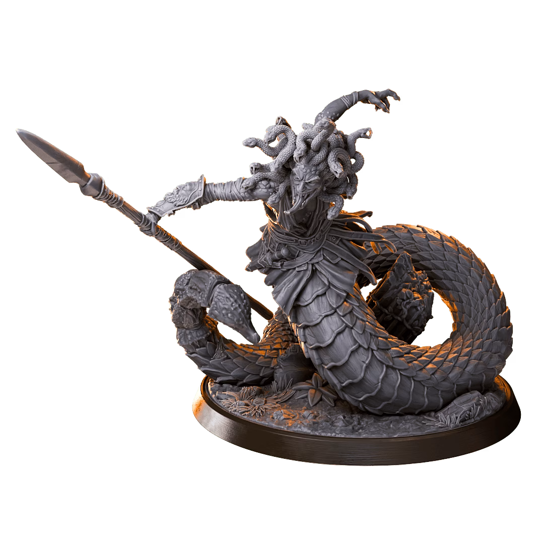 Unlock the ancient, petrifying power with the Serpentine Viper Matriarch! This intricately sculpted miniature depicts a majestic yet deadly creature, its scaly serpentine body coiled and ready to strike, while its multiple snake-heads for hair add to its terrifying allure. The details in her armor and spear highlight her warrior prowess. Ideal for a high-CR monstrous antagonist, a guardian of cursed treasures, or a challenging denizen of forgotten dungeons, her venomous presence will send shivers down your players’ spines and promise an unyielding battle for survival, where every glance is a threat.