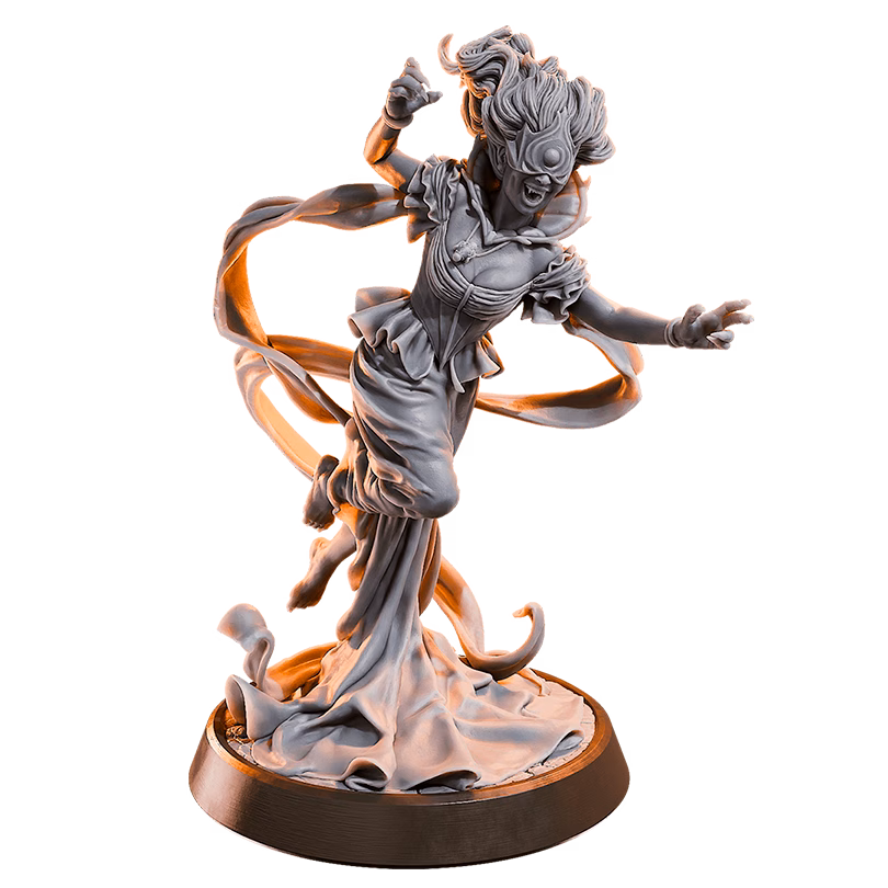 Intricate Hair Sculpt: Features long, wind-swept hair that adds to the model’s sense of frantic, supernatural movement.